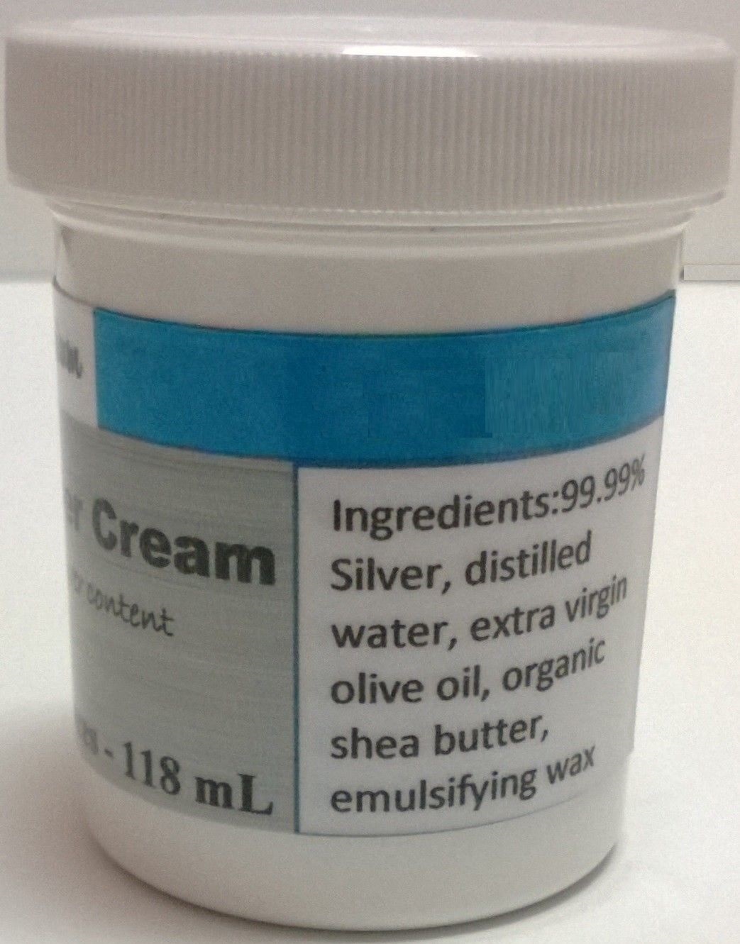 Ingredients: 99.99 % silver, distilled water, extra virgin olive oil, organic raw white shea butter, emulsifying wax, vitamin E.